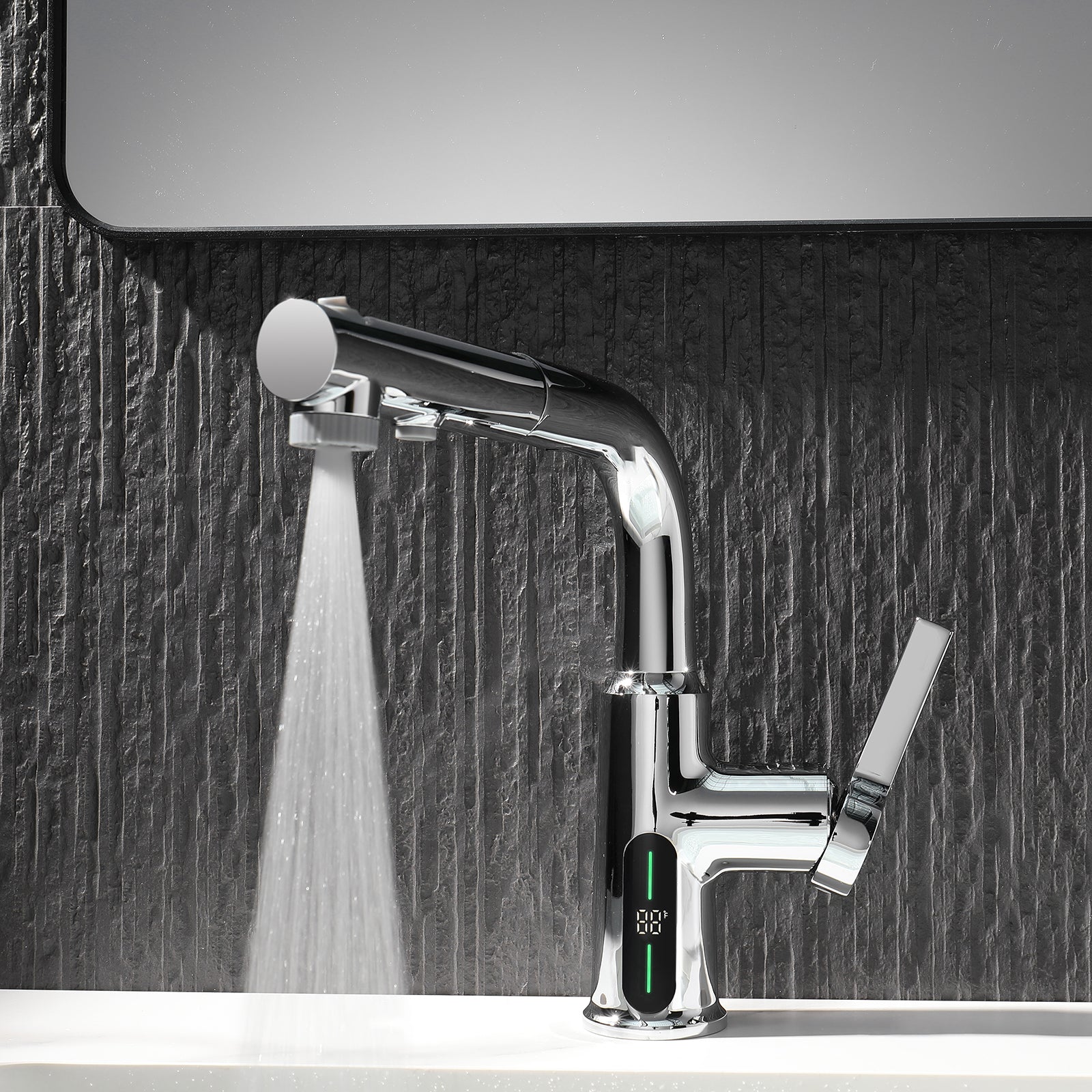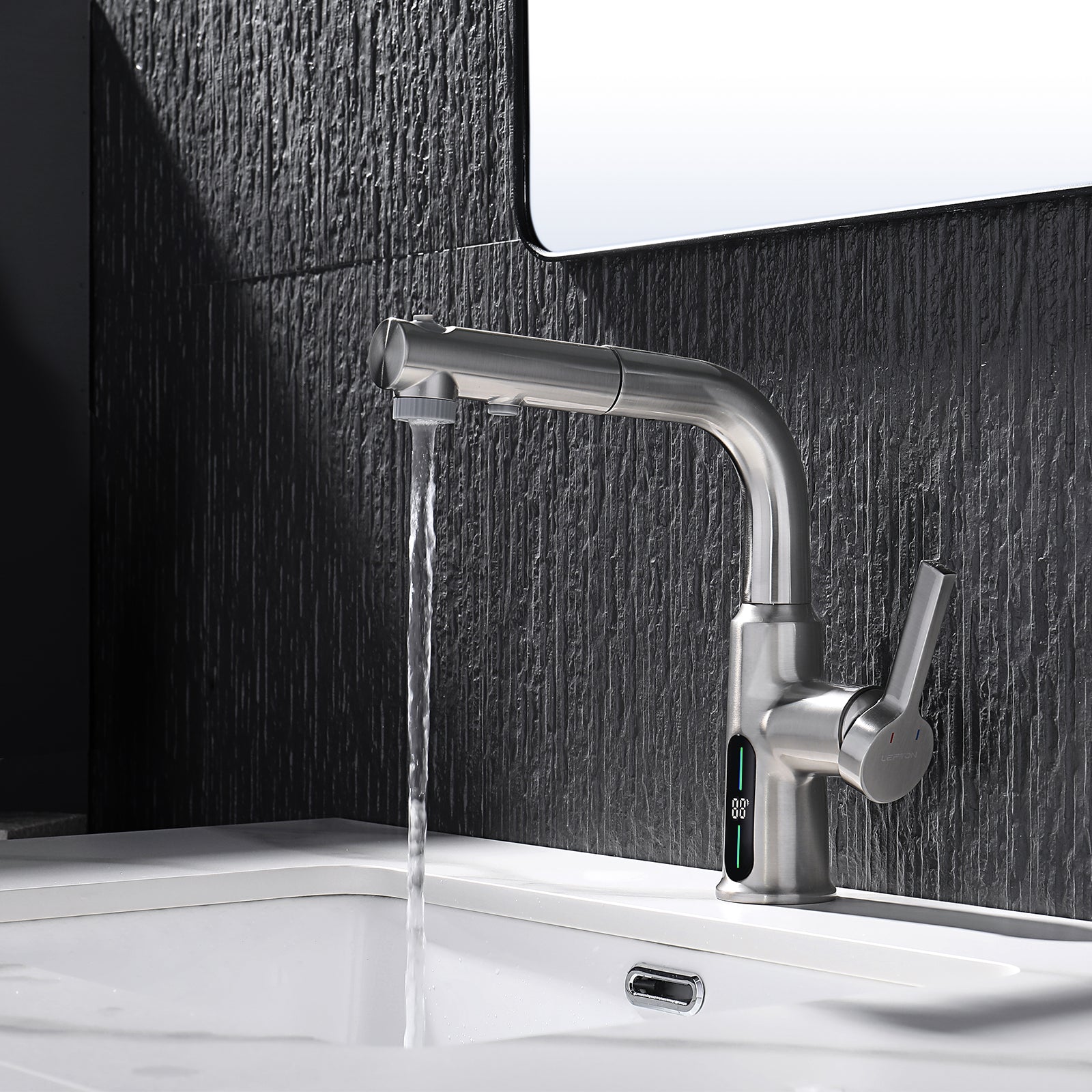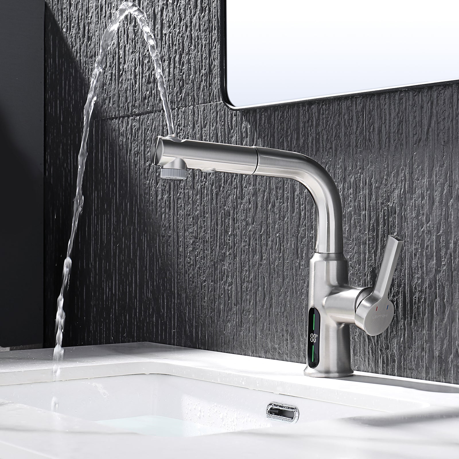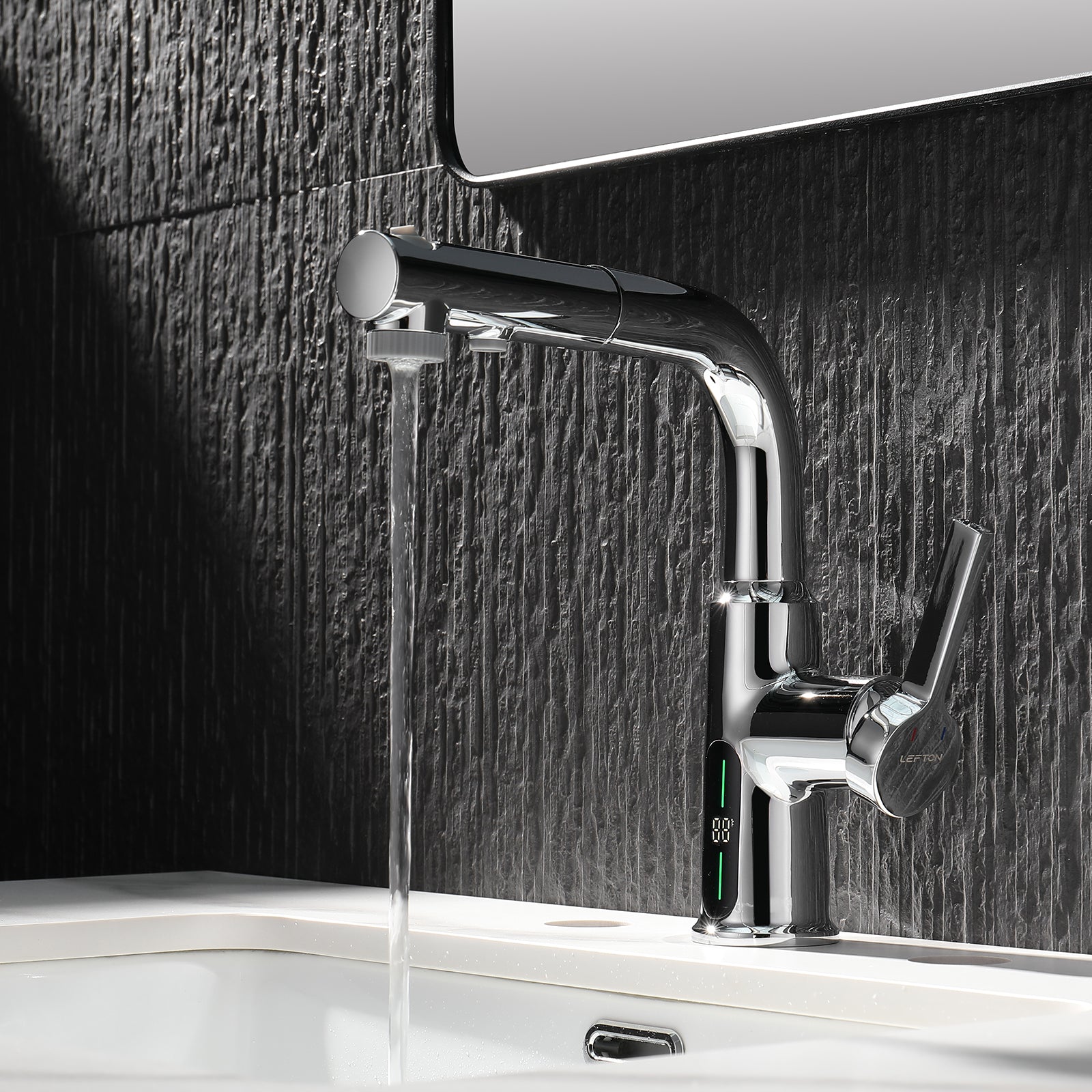 The Metora pull-out bathroom faucet, BF2501, boasts a streamlined, modern aesthetic that seamlessly integrates with contemporary bathroom decor. The LED digital display shows the water temperature in real time, ensuring a safer experience for everyone, and no electricity or batteries are required. This innovative faucet features a liftable design that allows you to adjust the height to your specific needs. Two water outlet modes and a mouthwash mode give a better water experience.
