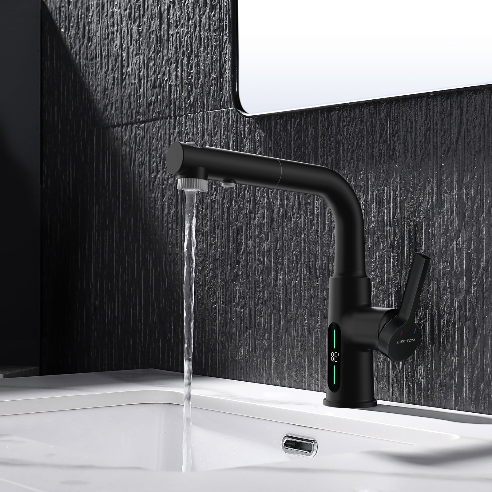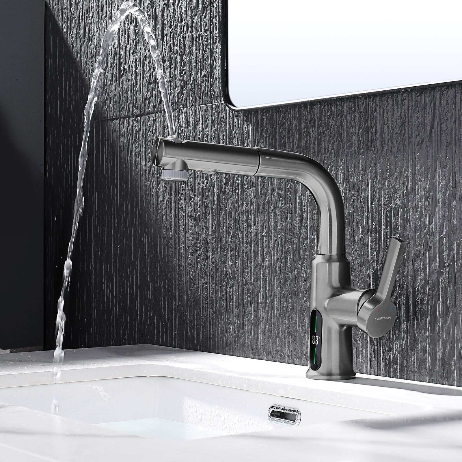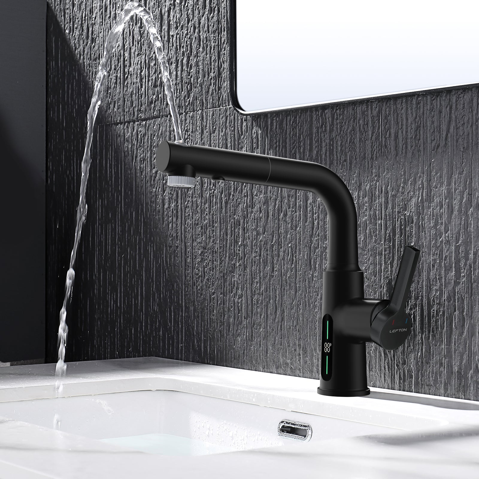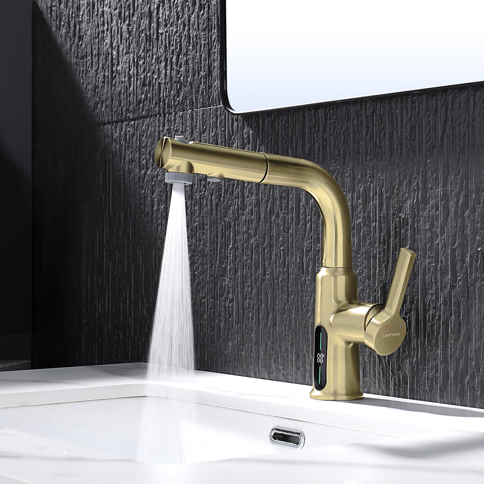 The Metora pull-out bathroom faucet, BF2501, boasts a streamlined, modern aesthetic that seamlessly integrates with contemporary bathroom decor. The LED digital display shows the water temperature in real time, ensuring a safer experience for everyone, and no electricity or batteries are required. This innovative faucet features a liftable design that allows you to adjust the height to your specific needs. Two water outlet modes and a mouthwash mode give a better water experience.