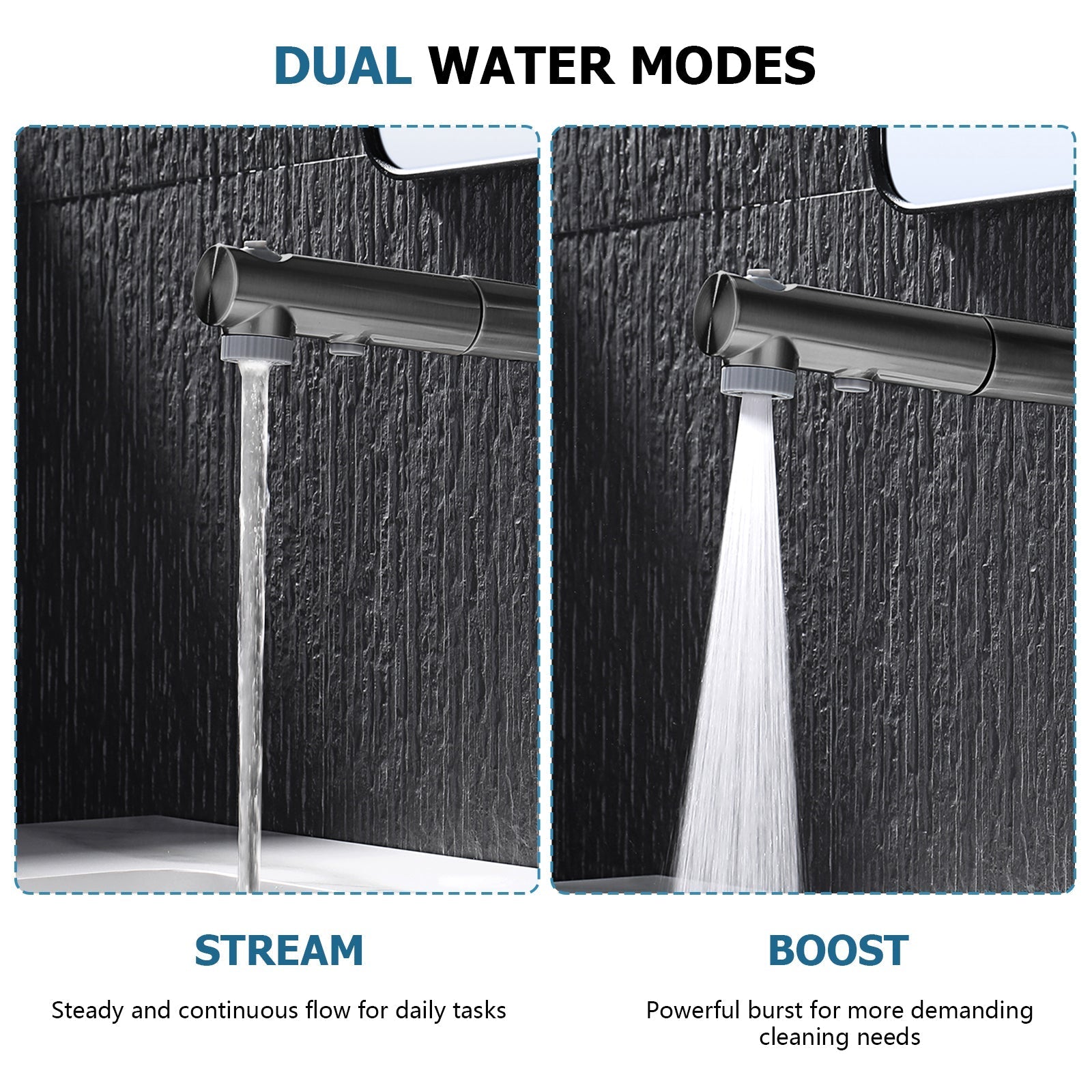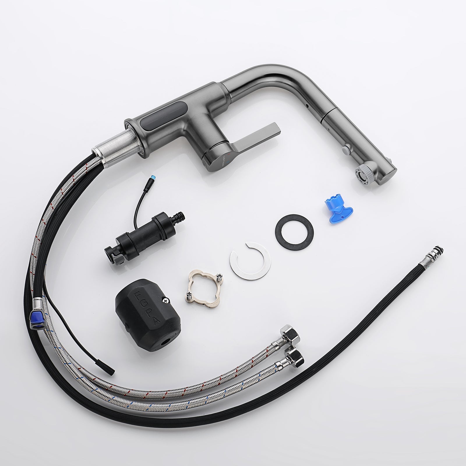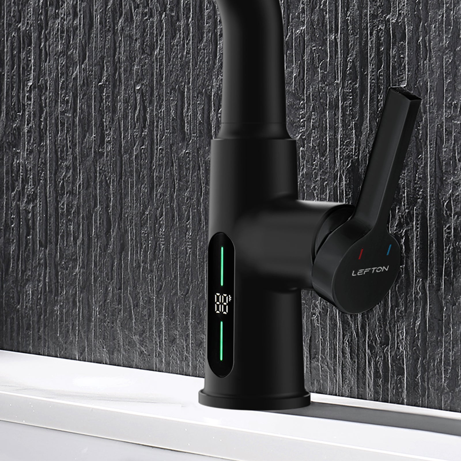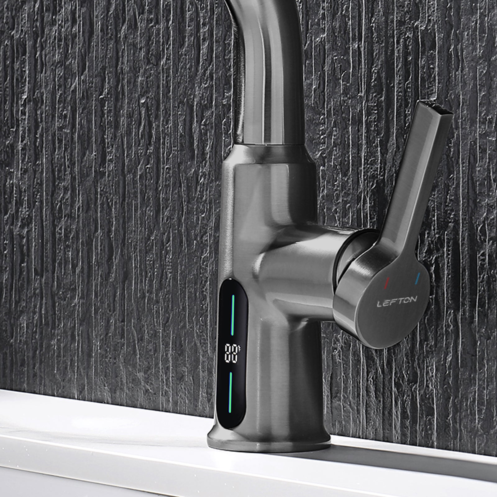 The Metora pull-out bathroom faucet, BF2501, boasts a streamlined, modern aesthetic that seamlessly integrates with contemporary bathroom decor. The LED digital display shows the water temperature in real time, ensuring a safer experience for everyone, and no electricity or batteries are required. This innovative faucet features a liftable design that allows you to adjust the height to your specific needs. Two water outlet modes and a mouthwash mode give a better water experience.