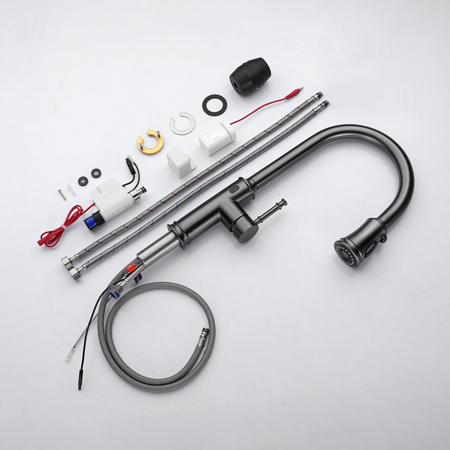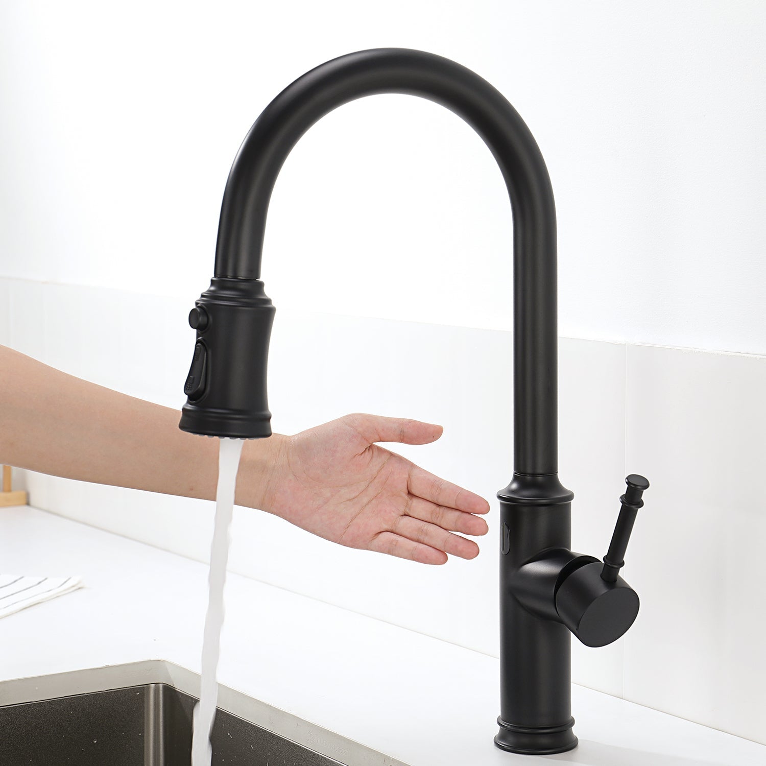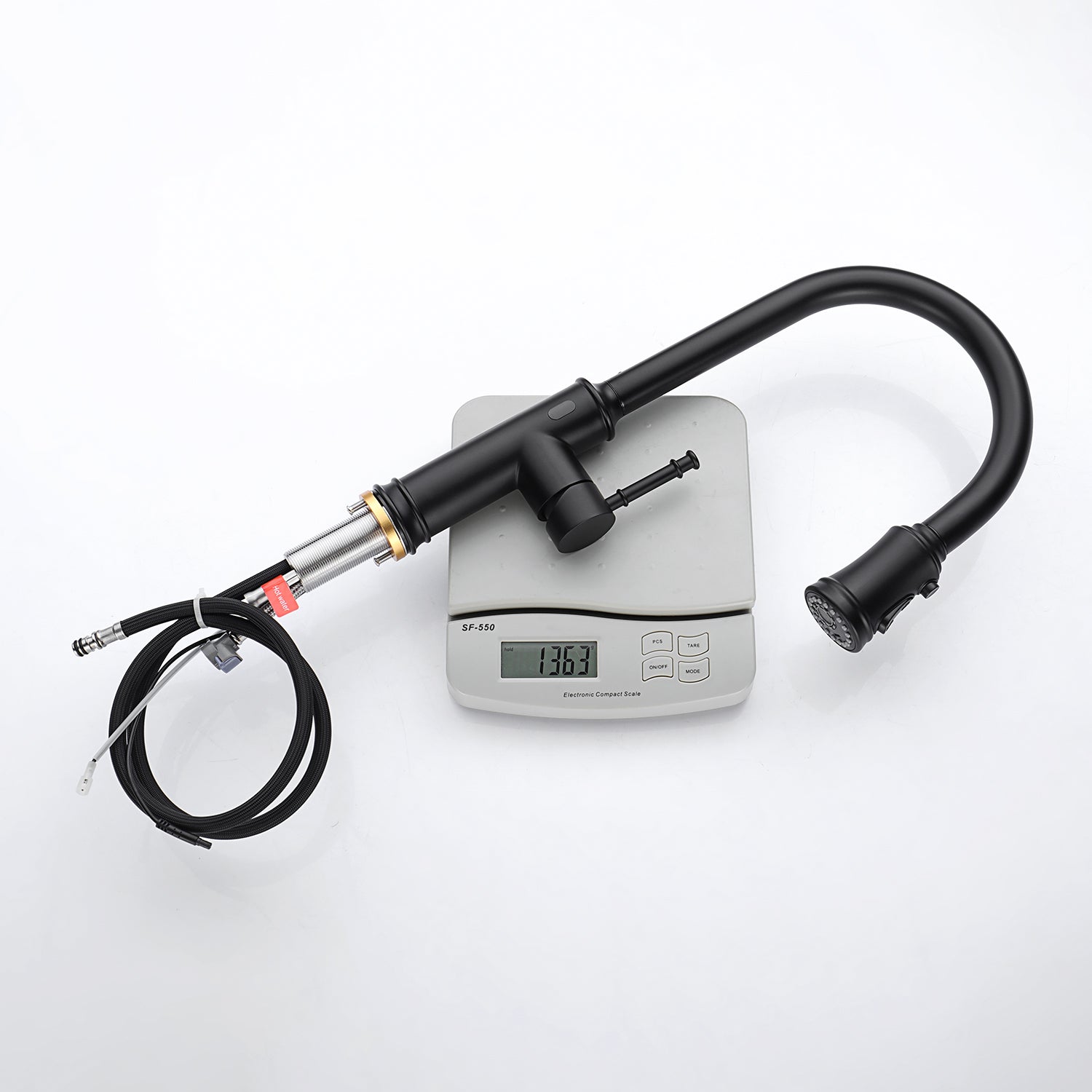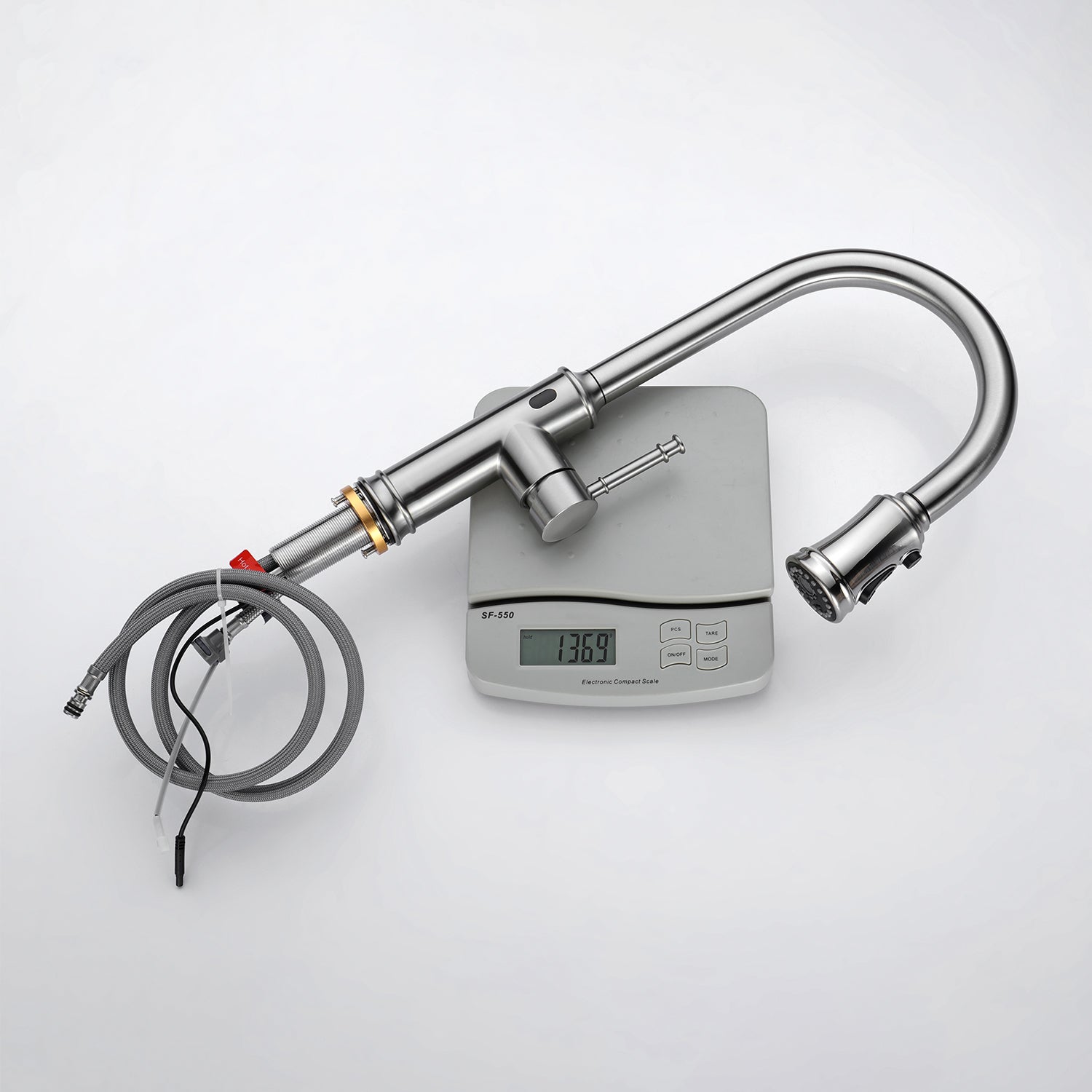 The Metora Pull-down Kitchen Faucet KF2210 features an elegant arched design, crafted from high-precision brass with a premium ceramic valve core for precise flow and temperature control. Its pull-down swivel spout with nylon hose easily cleans hard-to-reach areas, while the battery-powered motion sensor offers a convenient touchless experience with a simple wave.