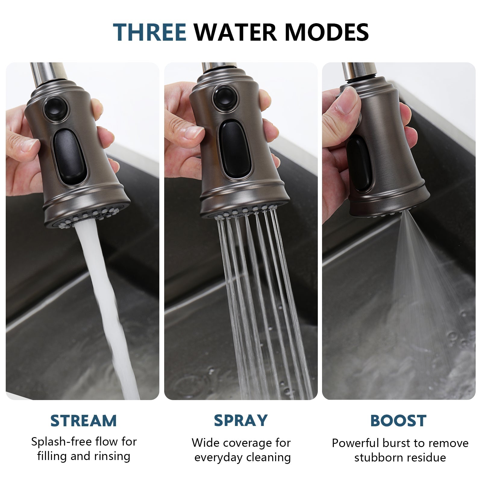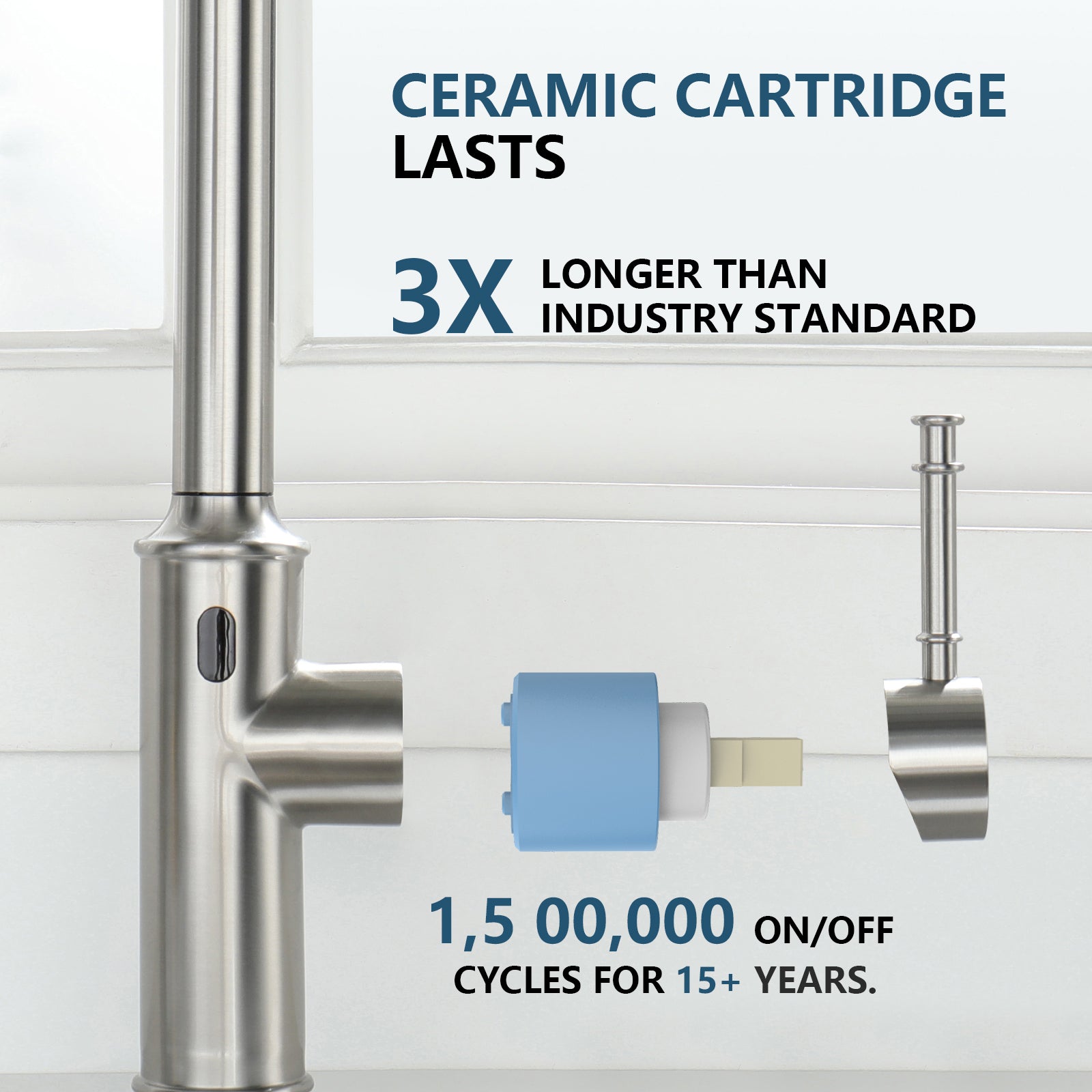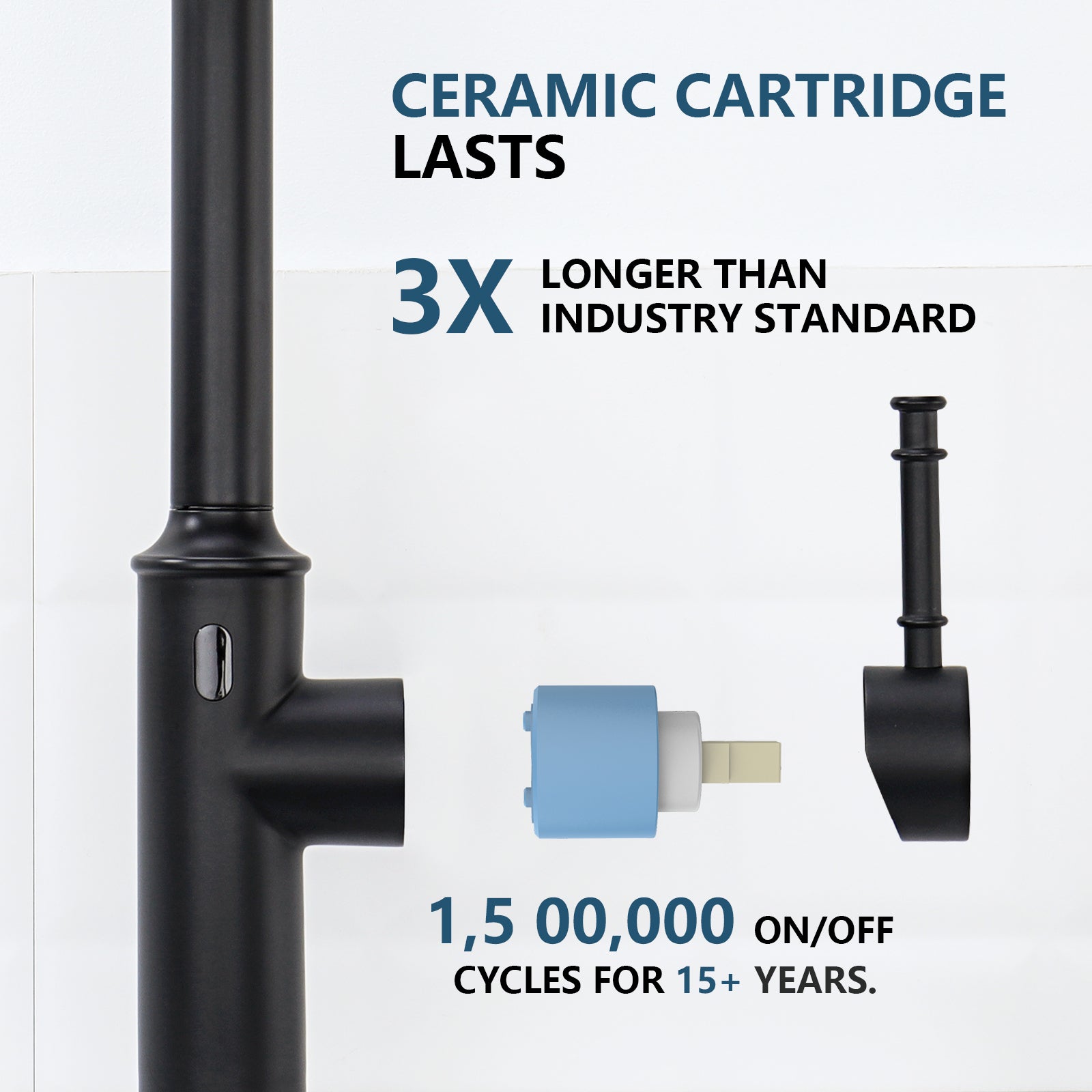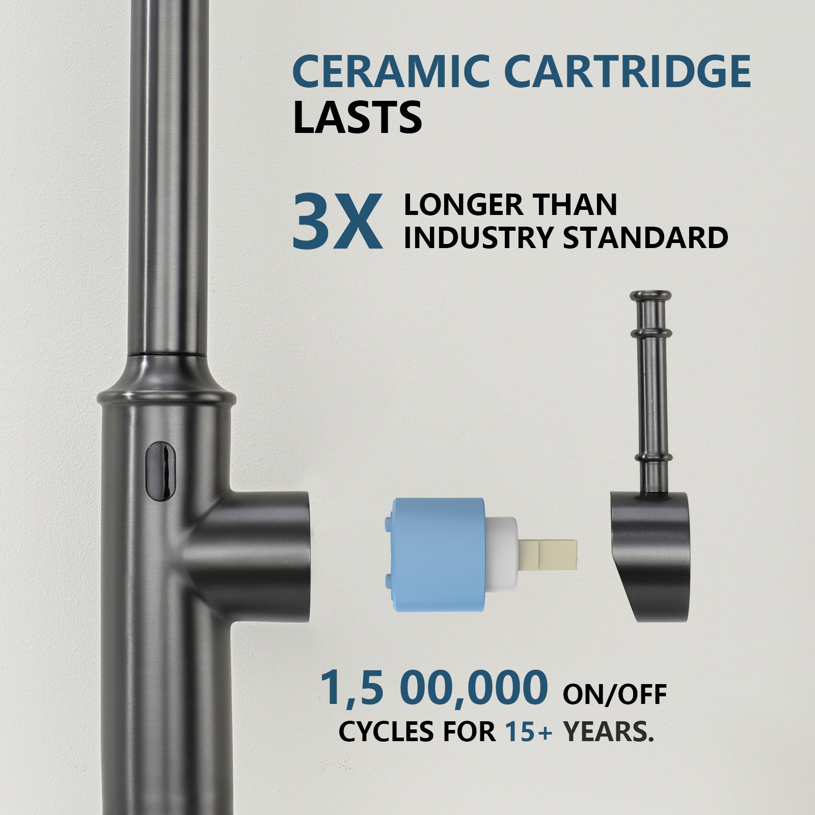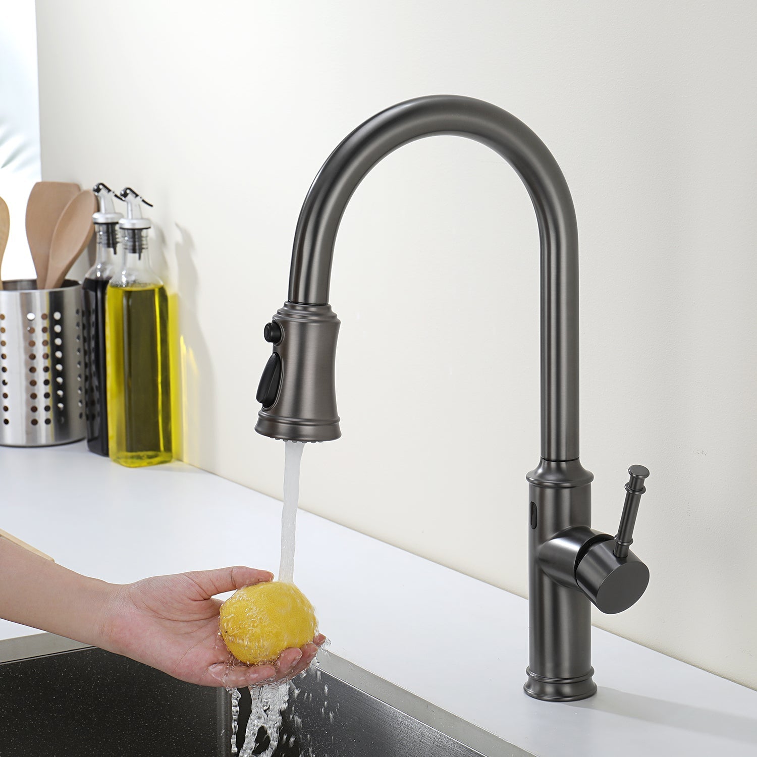 The Metora Pull-down Kitchen Faucet KF2210 features an elegant arched design, crafted from high-precision brass with a premium ceramic valve core for precise flow and temperature control. Its pull-down swivel spout with nylon hose easily cleans hard-to-reach areas, while the battery-powered motion sensor offers a convenient touchless experience with a simple wave.