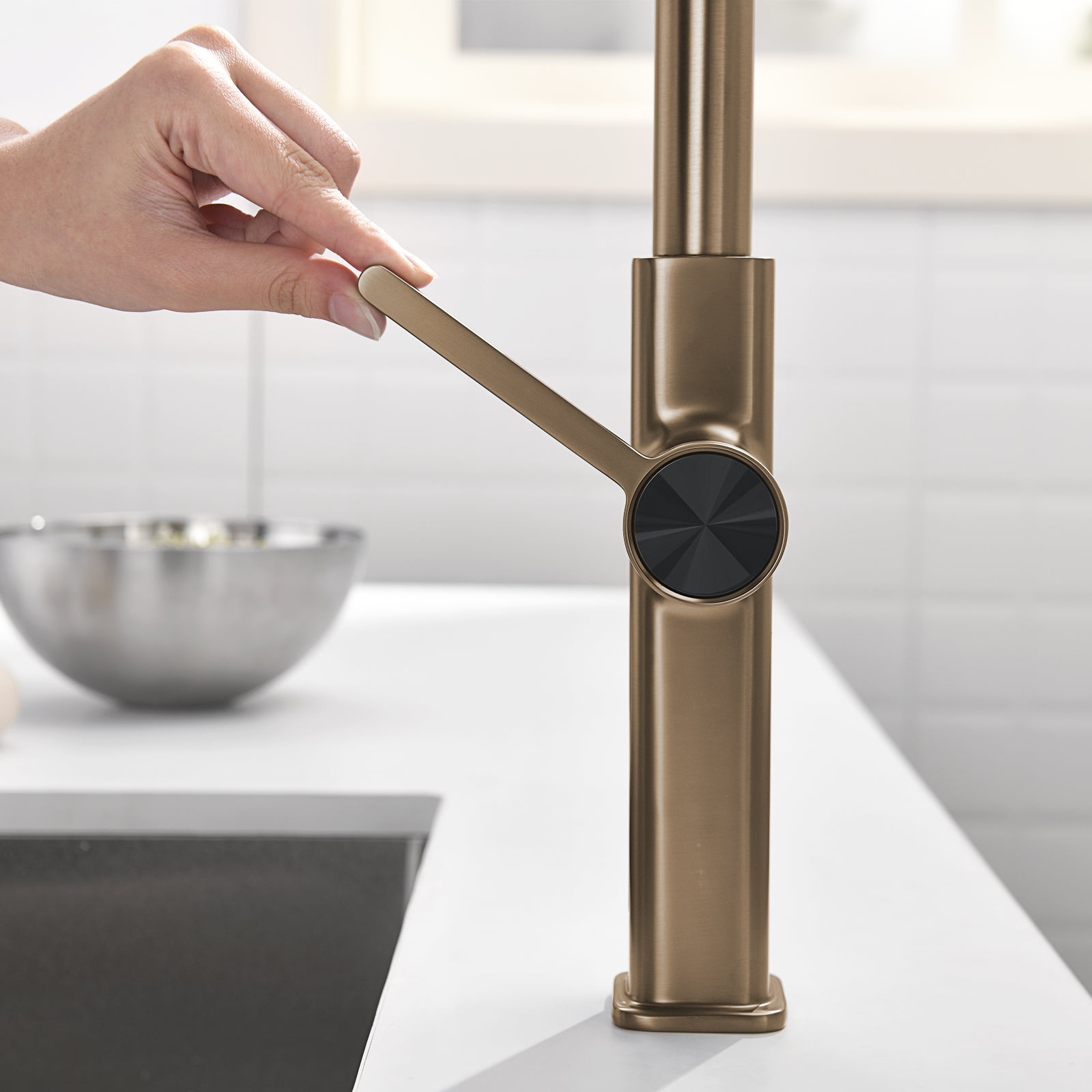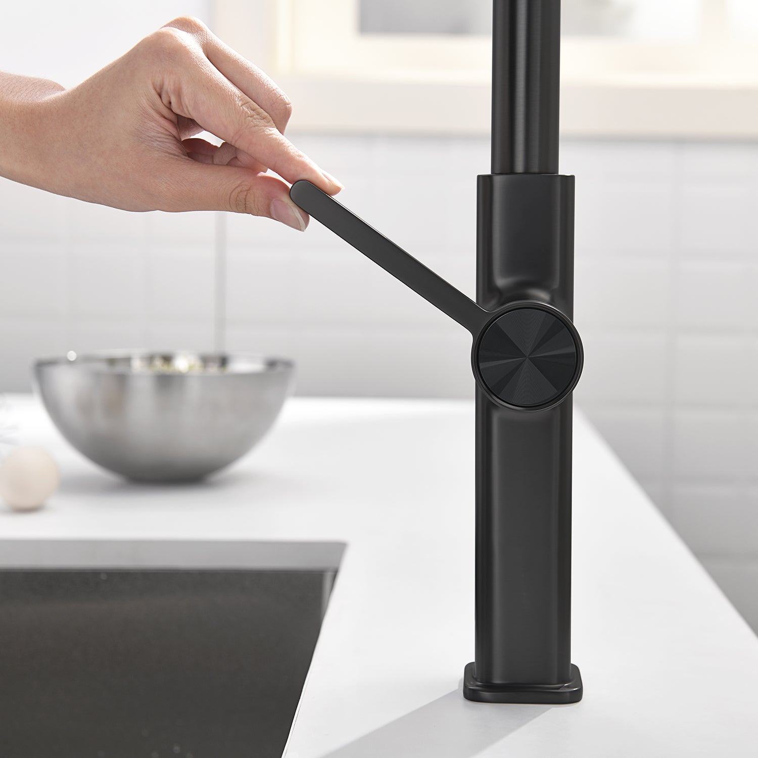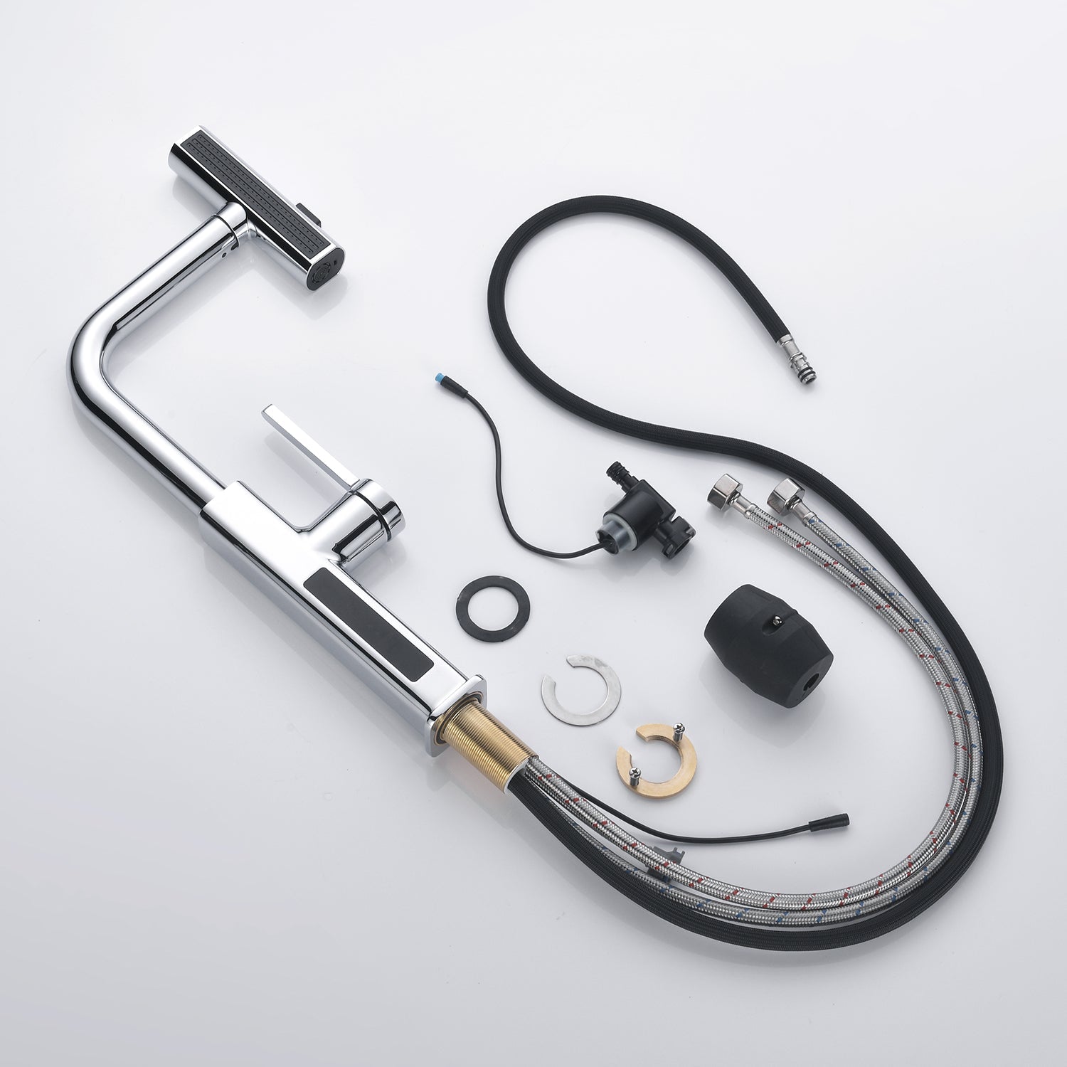 The KF2209 Kitchen Faucet is crafted from durable copper and equipped with a battery-free digital display plus a smart rotating nozzle that switches effortlessly between waterfall and stream. Available in six finishes, it blends seamlessly with any kitchen style. Pair it with the multi-angle glass rinser for instant, one-touch cleaning that stops automatically when lifted.