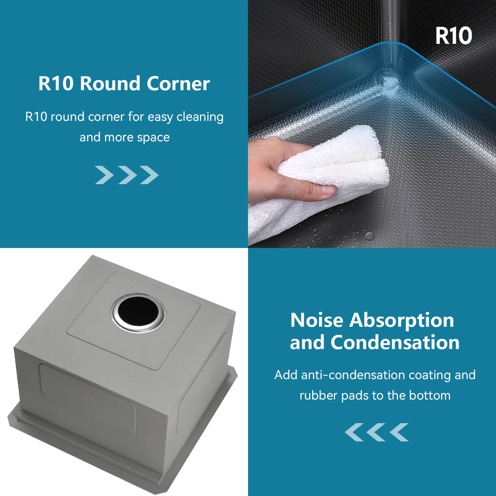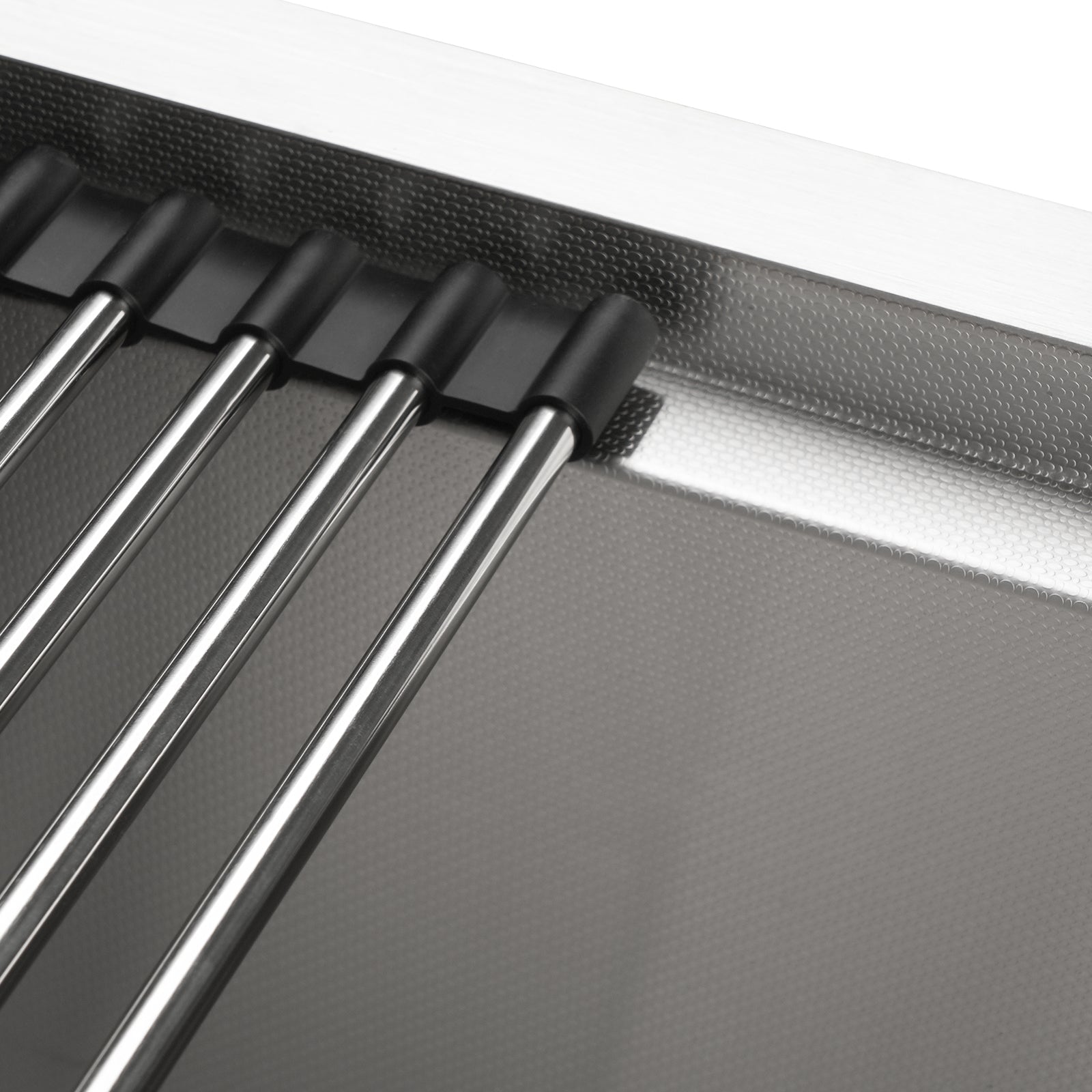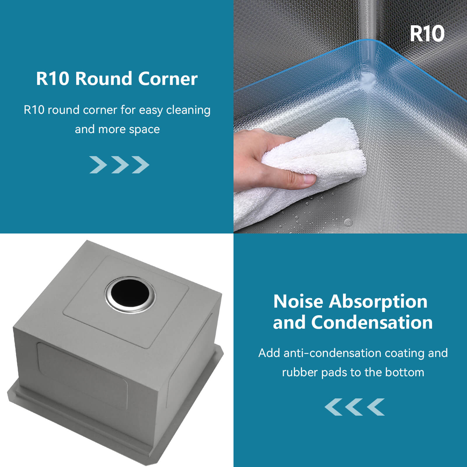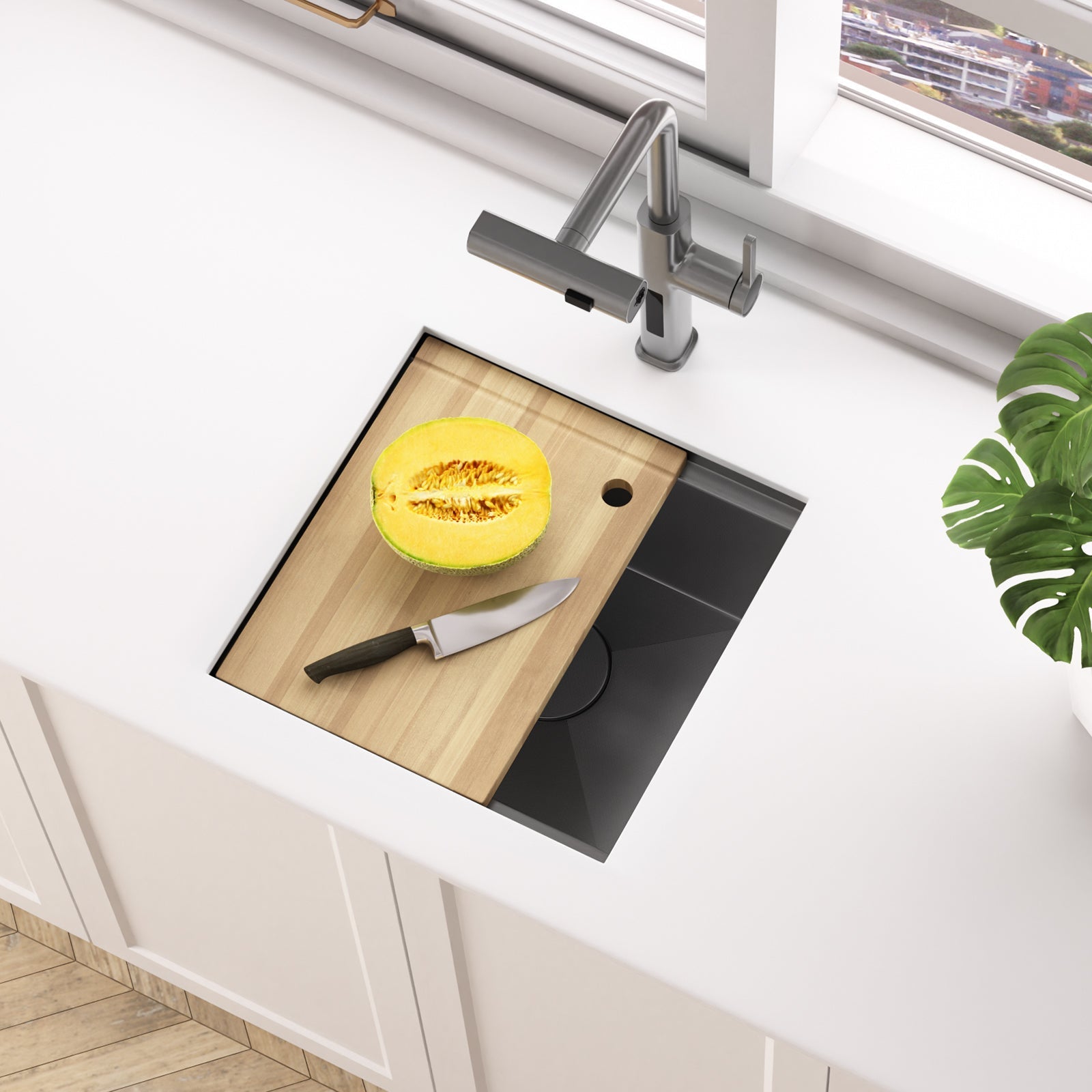 Optimize small kitchens with this compact 17"x17" undermount stainless steel bar sink. Constructed from heavy-duty 16-gauge stainless steel for maximum durability and rust resistance. Includes essential accessories (cutting board, bottom grid, rack) for seamless multi-tasking. Space-saving design fits tight layouts perfectly. Features quick undermount installation with pre-drilled holes and clear instructions. Ideal for efficient prep in limited spaces.