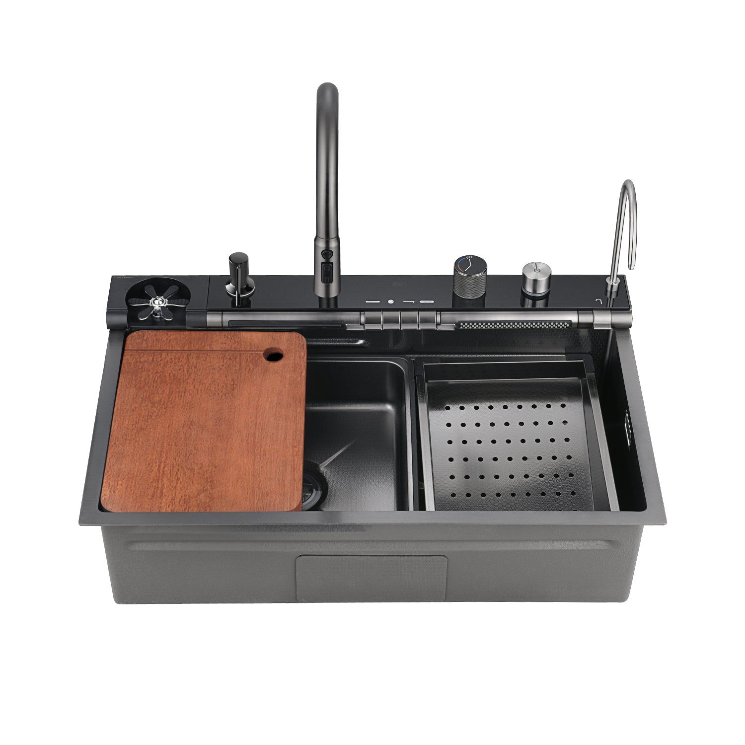 Multiple Water Outlet Modes: Experience dynamic dish cleaning with two adjustable-angle waterfall faucets and a versatile pull-out faucet offering multiple water modes.