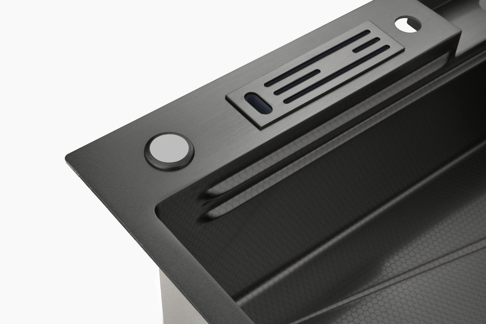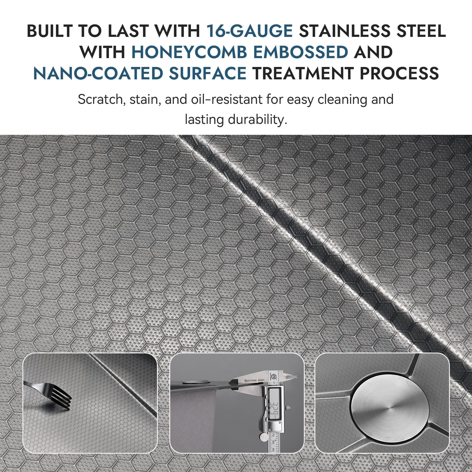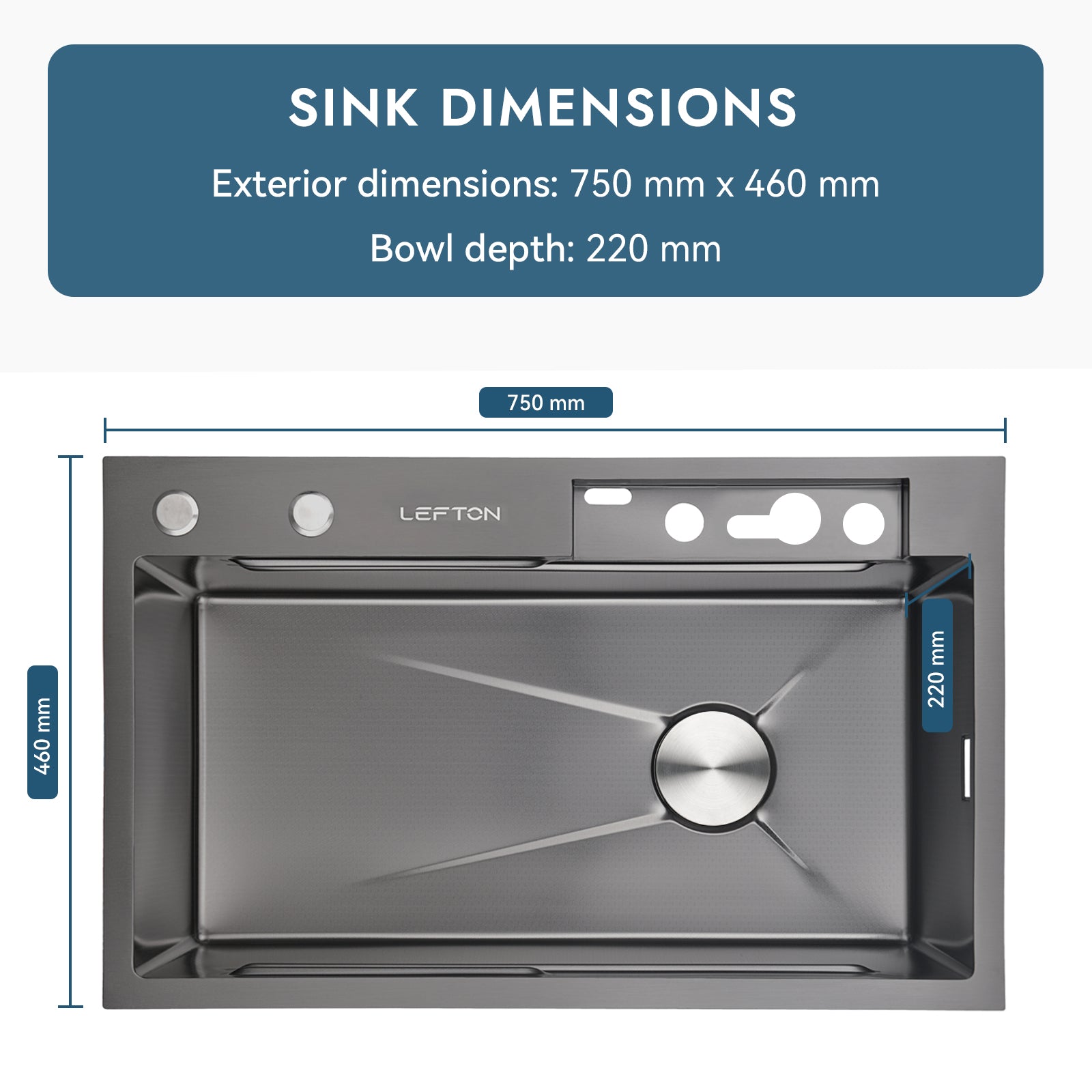 The Metora waterfall workstation kitchen sink KS2204 is designed with honeycomb embossed and nano-coated, fine-line brushed finish that makes it resistant to chipping, cracking or burning and appearance is more elegant. It can match glass rinser KFR2202 and soap dispenser KSD2201 (included in the package), which makes the sink more useful. The waterfall faucet can be switched between waterfall mode and faucet mode by 'Piano Button'. The digital temperature display (battery-free and shown on Celsius only) allows you do the cleaning at the optimum temperature. We offer a 5-year warranty on the sink set and its accessories.