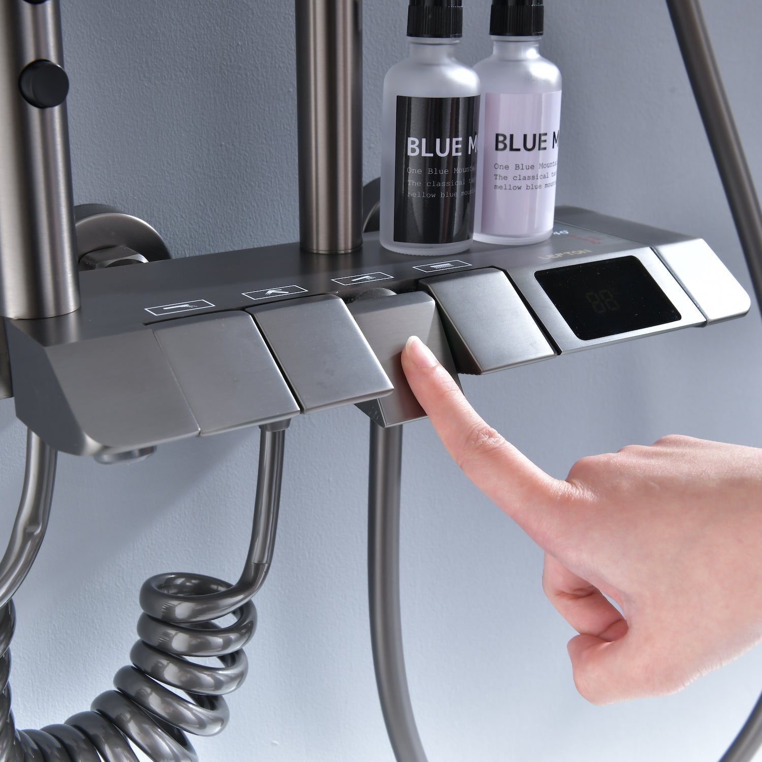 The Metora SST2202 shower system is sturdy with a brass body and limescale-resistant silicone nozzles. It serves as a 4-in-1 system, offering a rainfall shower head, hand shower, sprayer, and adjustable water flow. Height-friendly sliders, thermostatic tech, and a digital display for water temperature add convenience. The hand shower features three spray modes, and the system saves 30% water without compromising performance.