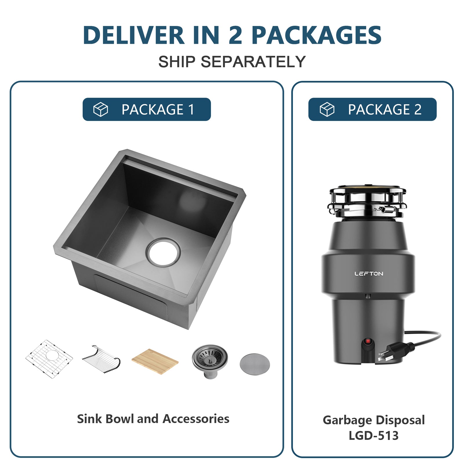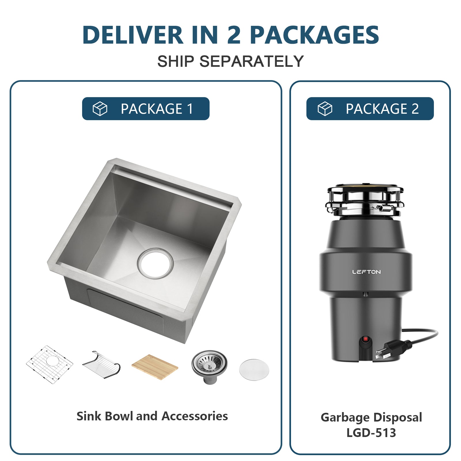 Optimize small kitchens with this compact 17"x17" undermount stainless steel bar sink. Constructed from heavy-duty 16-gauge stainless steel for maximum durability and rust resistance. Includes essential accessories (cutting board, bottom grid, rack) for seamless multi-tasking. Metora 1/2 HP Continuous Garbage Disposal provides a more efficient way to grind most daily kitchen waste, helping to keep your kitchen clean and protect our environment.