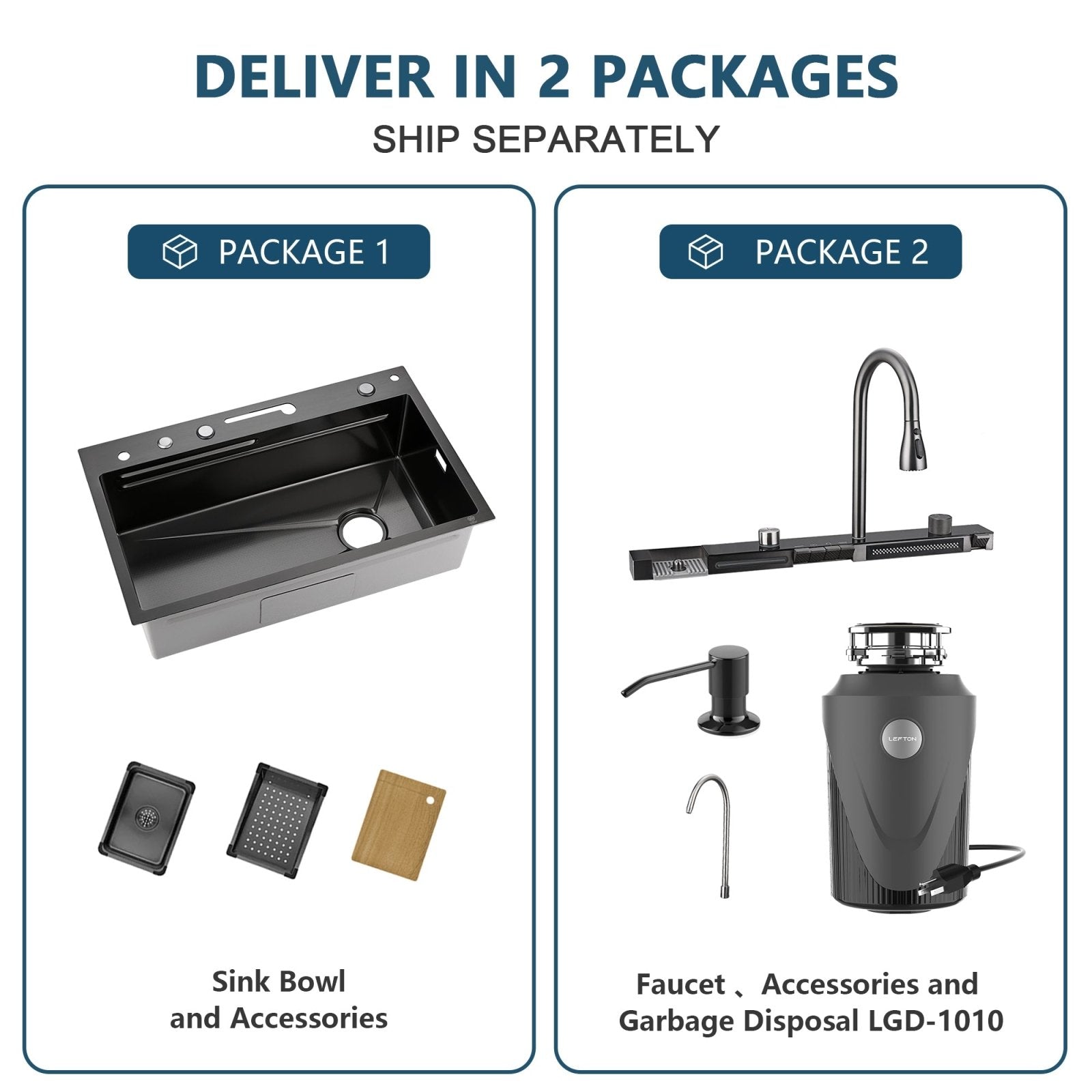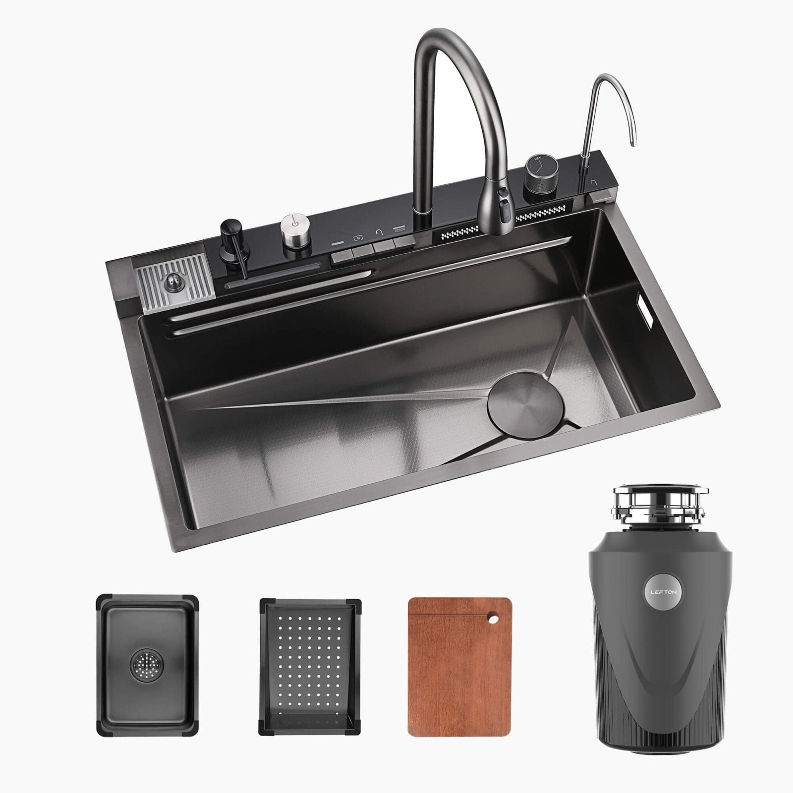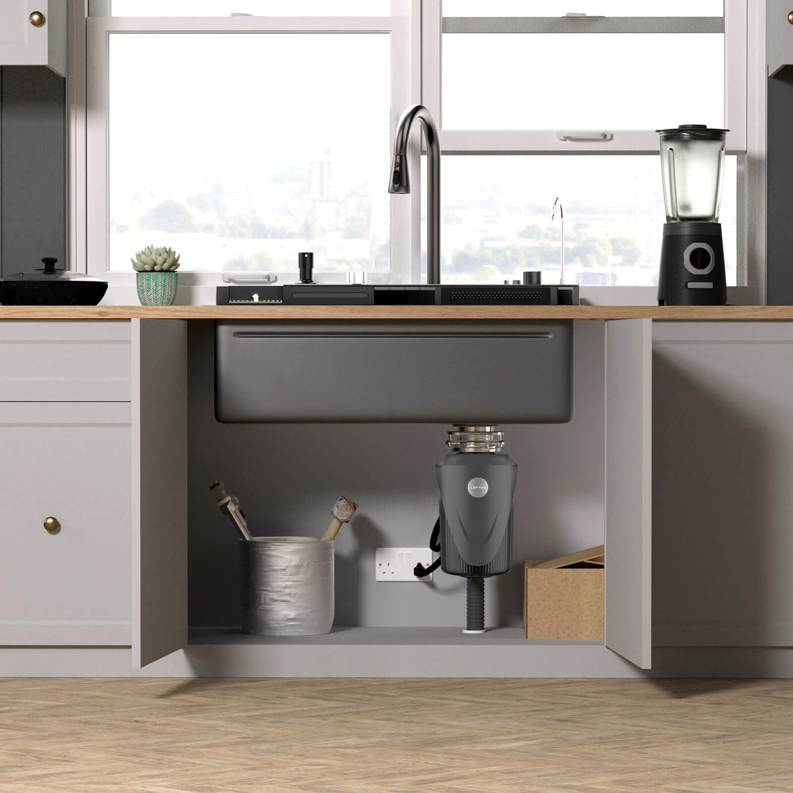 The Metora Kitchen Sink KS2206L is stainless steel, measuring 33 x 22 inches. Its honeycomb embossed, nano-coated surface resists water and oil stains, as well as wear and scratches. This 1 HP Continuous Feed Garbage Disposer is a high-performance kitchen essential designed to efficiently and sustainably tackle food waste.