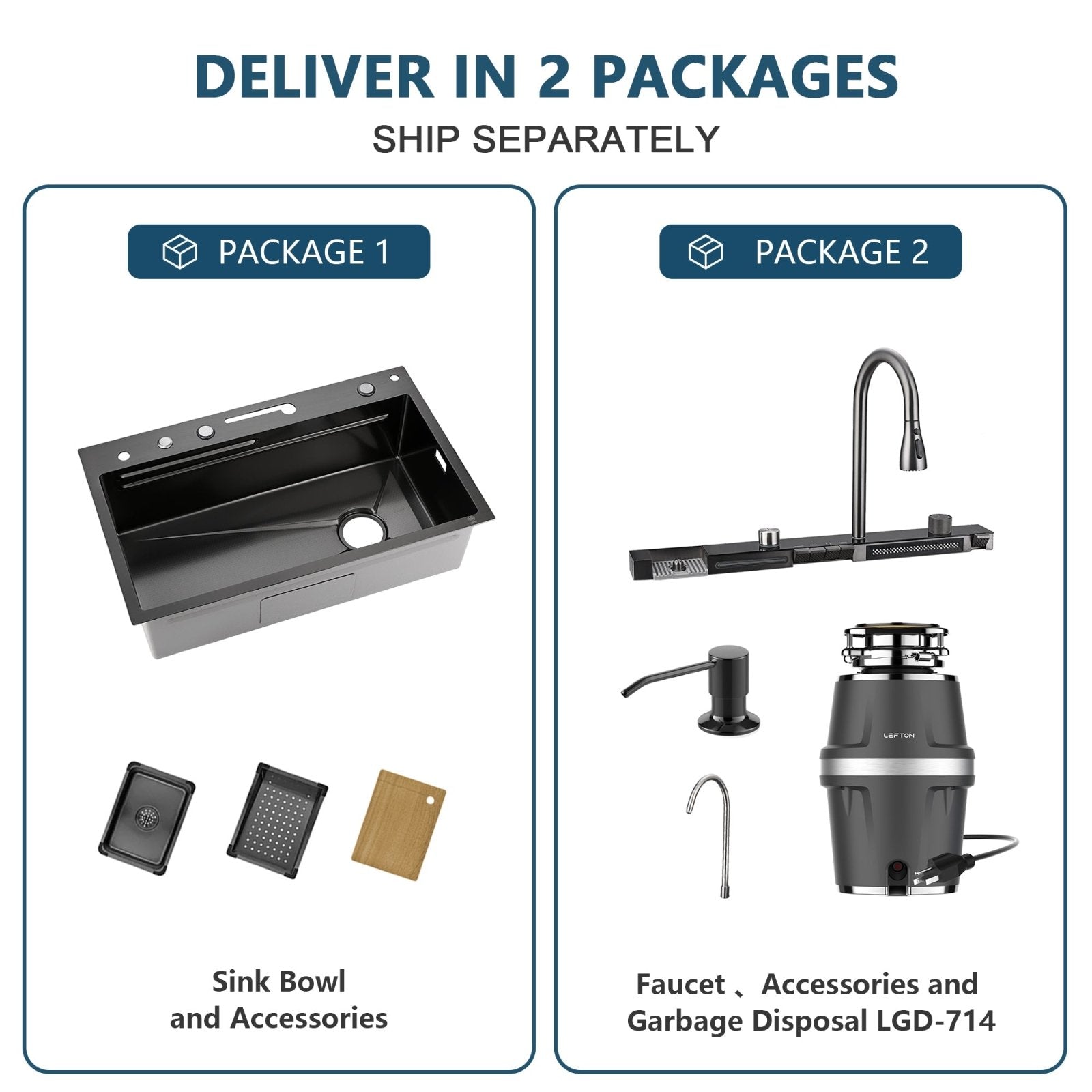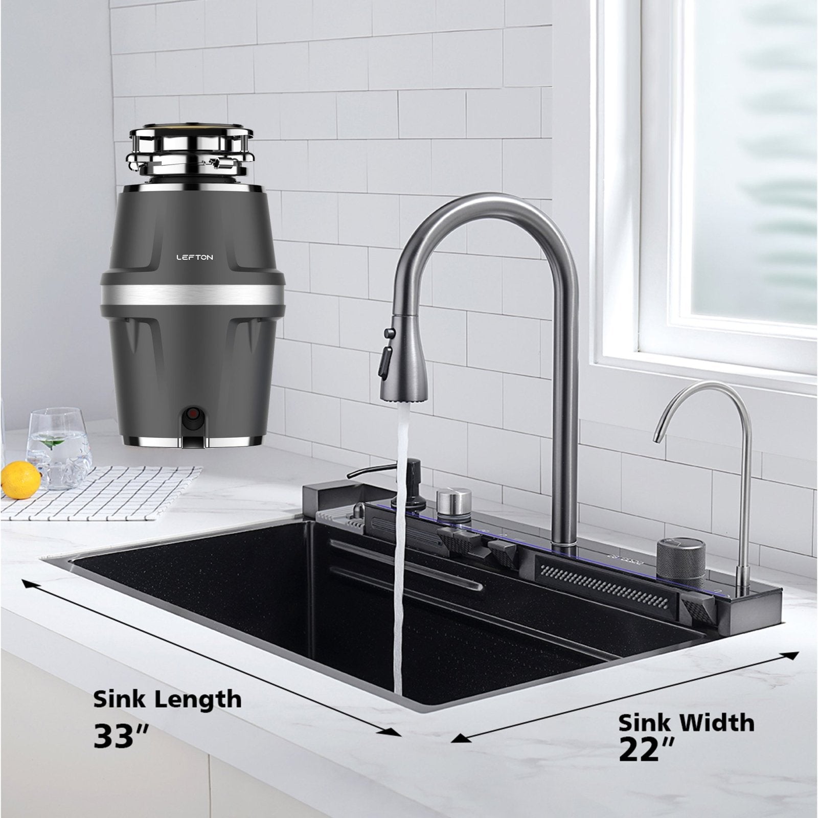 The Metora KS2206L Kitchen Sink (33 x 22 inches) is made of stainless steel with a honeycomb-embossed, nano-coated surface that resists stains, wear, and scratches. It features two waterfall faucets, a digital temperature display, LED lighting, and three pull-out water modes for easy cleaning. The Metora 3/4 HP Garbage Disposal handles tough food scraps quietly with a 5-level grinding system for smoother performance.