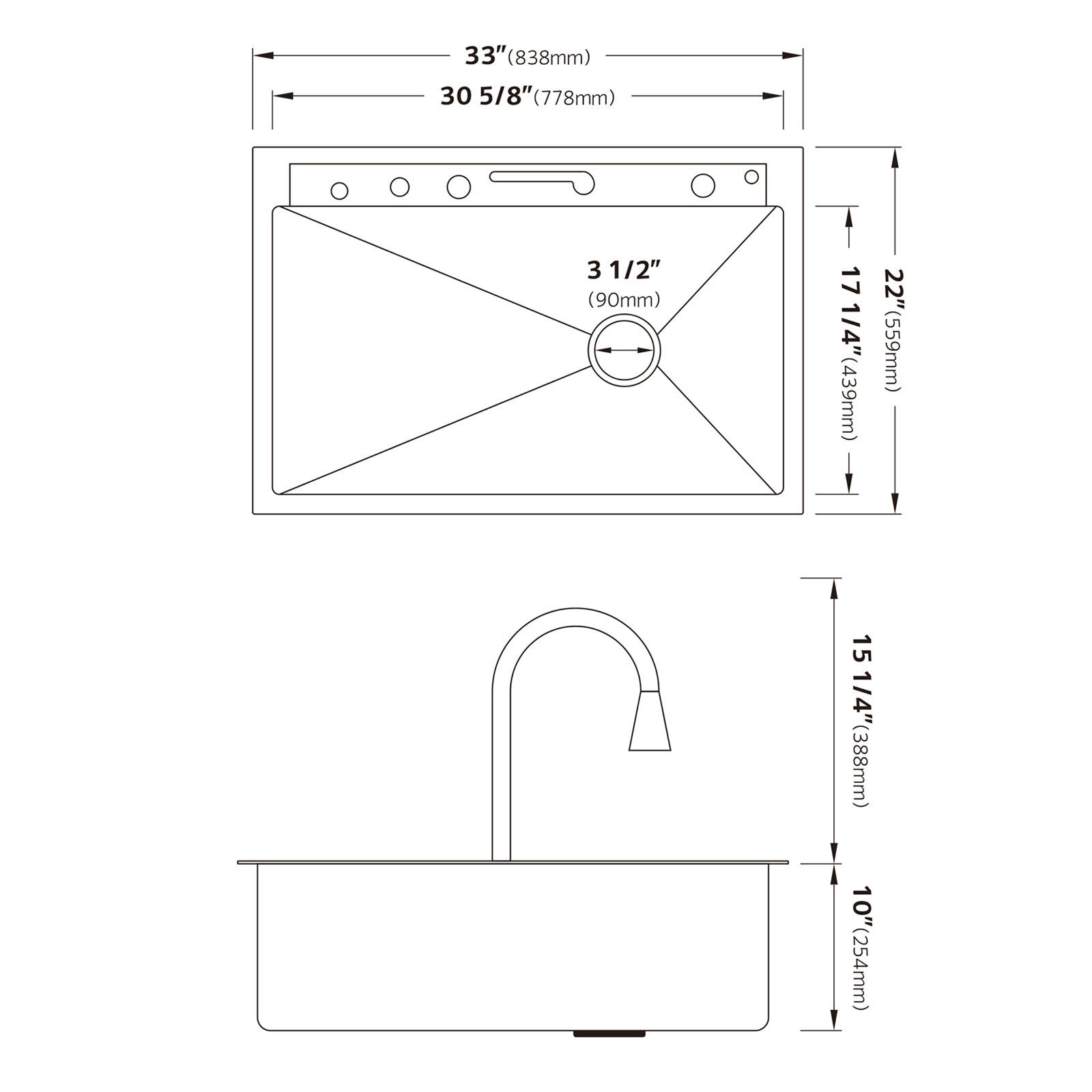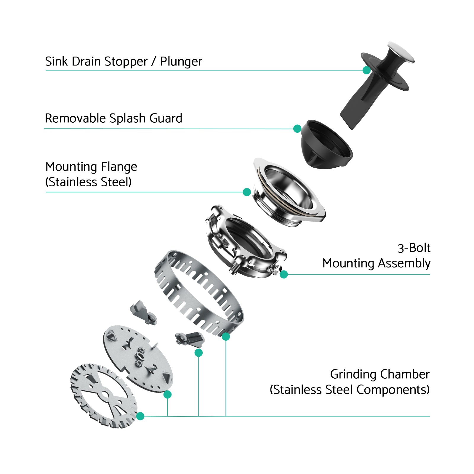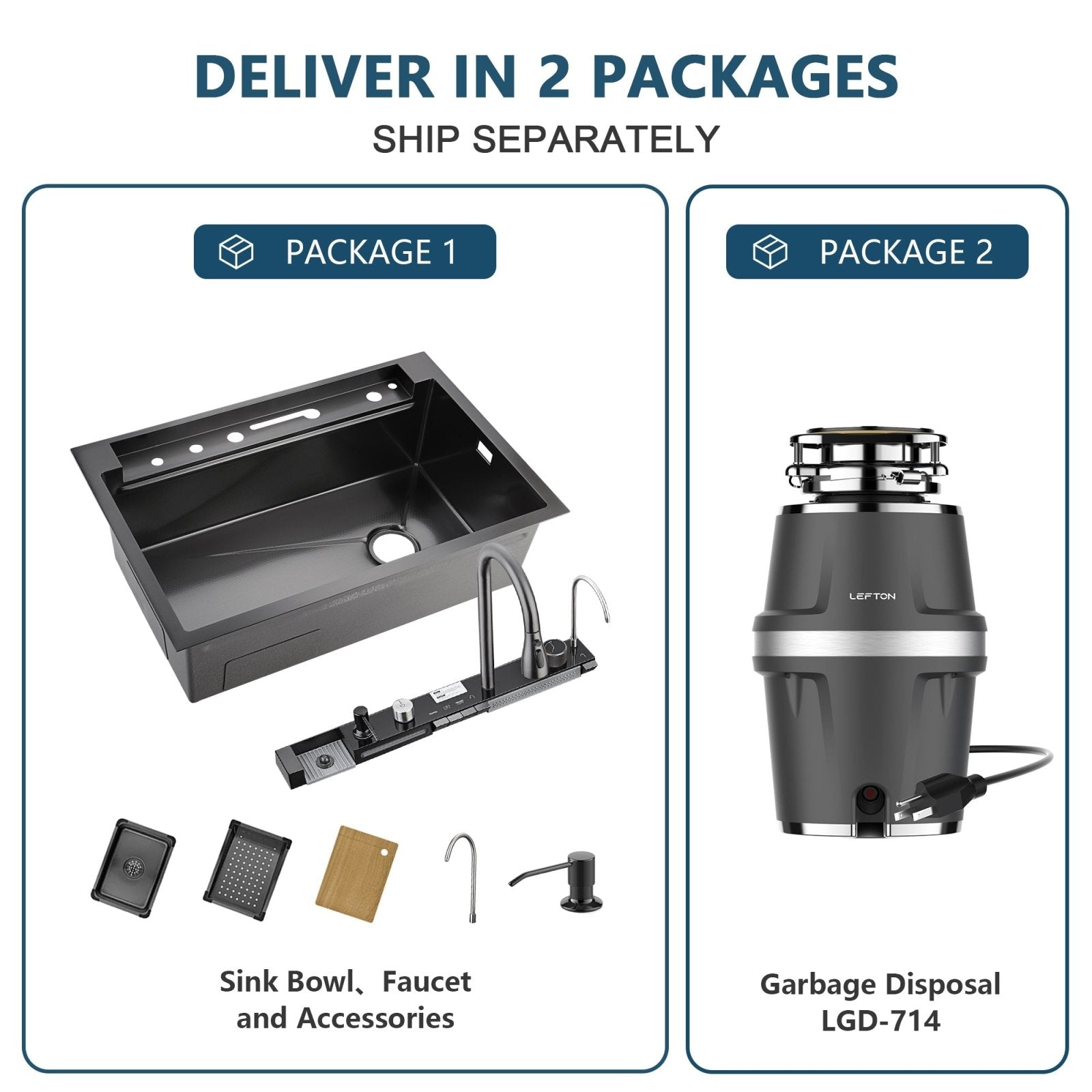 The KS2206L-PRO kitchen sink, constructed from durable stainless steel, features a recessed faucet design for enhanced installation and space efficiency. It includes dual waterfall faucets and a pull-down sprayer with three outlet modes. An integrated LED display provides real-time water temperature readings. Metora 3/4 HP Continuous Garbage Disposal is designed for cooking enthusiasts to deal with tough food scraps and waste quietly and efficiently.