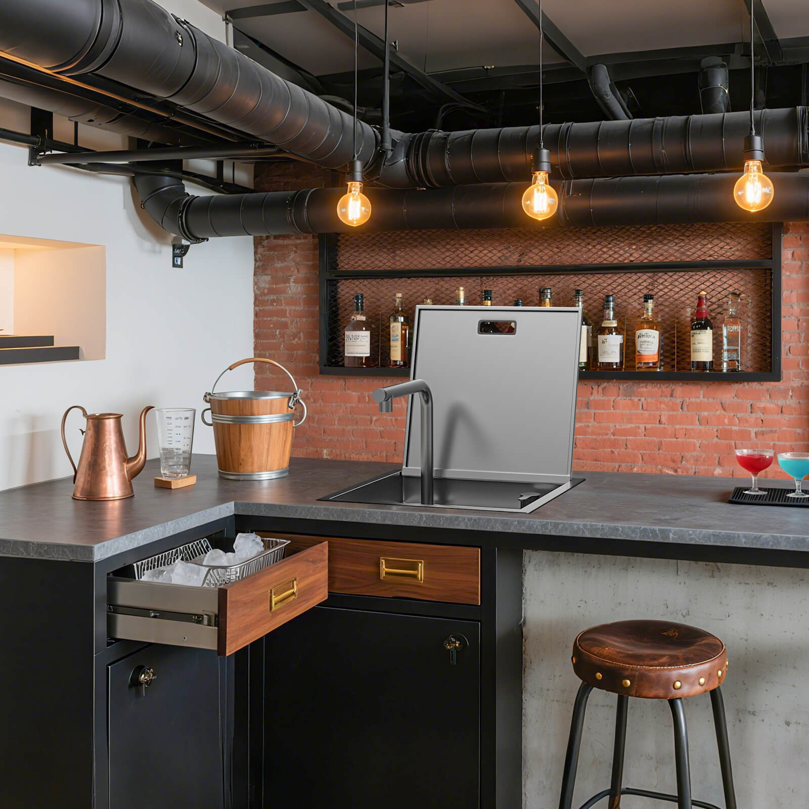 Metora 17"x17" Stainless Steel Concealed RV & Kitchen Bar Workstation Sink with Liftable Pull-Out Faucet and Slow Drop Cover-BS2502